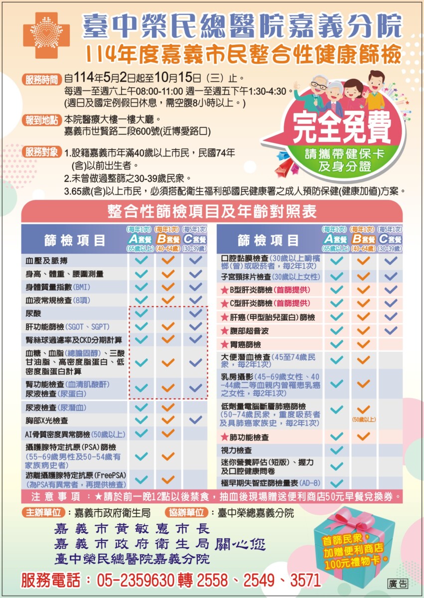 【記者 劉芳妃/嘉義市 報導】為守護市民健康,臺中榮總嘉義分院配合嘉義市政府衛生局,自即日起至10月15日推動114年度「市民整合性健康篩檢」,提供週一至週六彈性時段,方便市民依照個人作息前往篩檢。設籍嘉義市且年齡介於30至39歲者,每5年可接受一次整合性篩檢,40歲以上民眾則可每年檢查一次。嘉義榮院也全面優化篩檢流程,從報到、檢查引導、報告解說到後續追蹤,提供完整的貼心服務,讓市民長輩及鄉親輕鬆掌握健康。